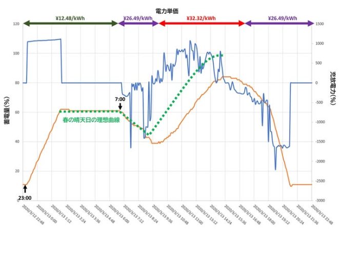 今日も晴れだと見込んで、昨日の結果から深夜電力で60%の蓄電で良いだろうと思っていたら、何と今日は曇り!なので、蓄電のスタートが遅れてしまい、午後3時半に見込んだ蓄電率100%に届かず。結果的に深夜は80%蓄電が必要だったということ。