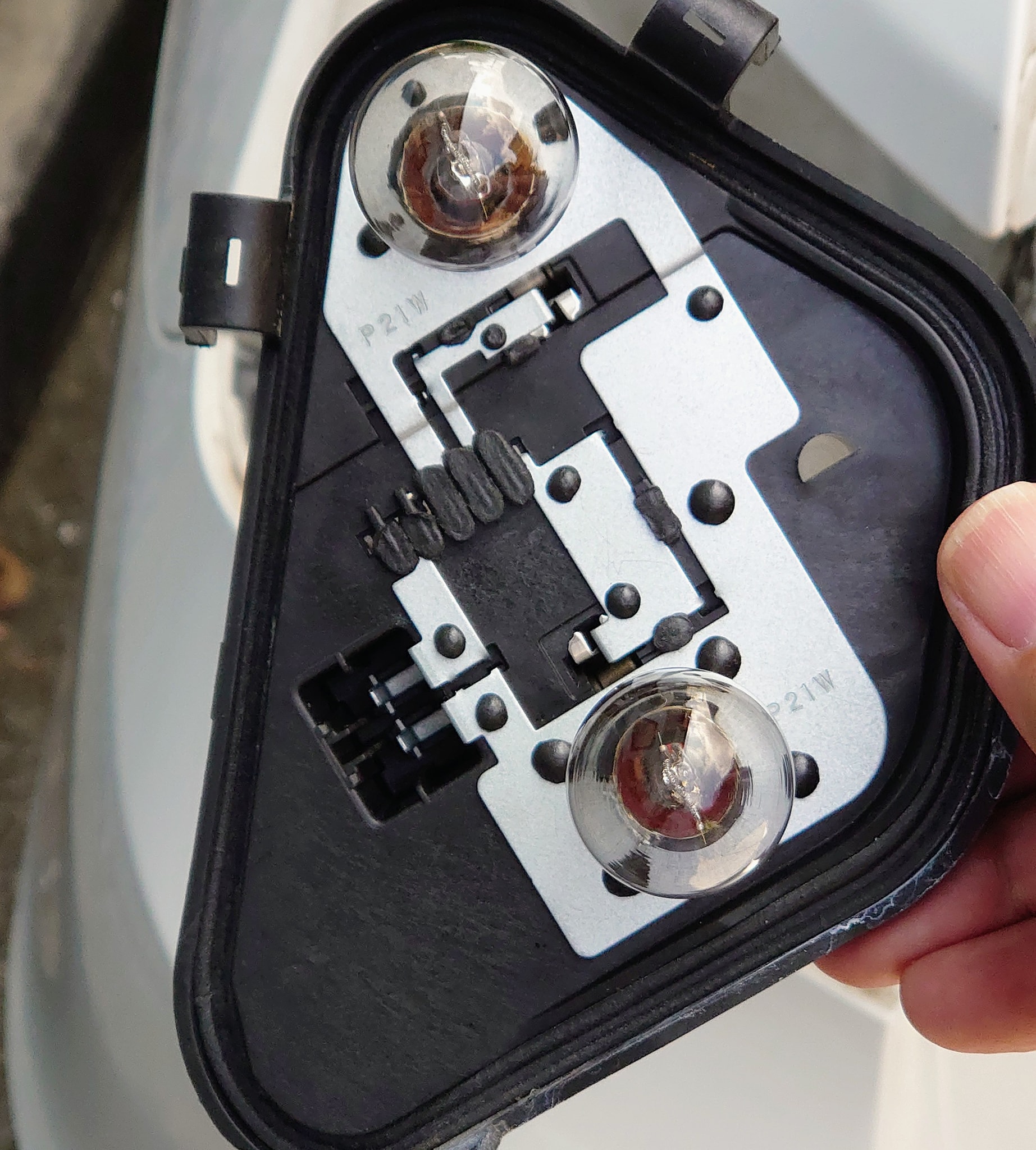 新しいP21Wを買ってきて、グラつかないよう加工して取り付け。しばらく様子見。