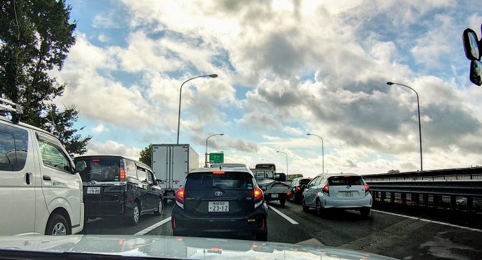 もう、一時間に2kmしか進まんとか、なんだこりゃ。下道も大渋滞引き起こしてて、高速を降りることもままならない!