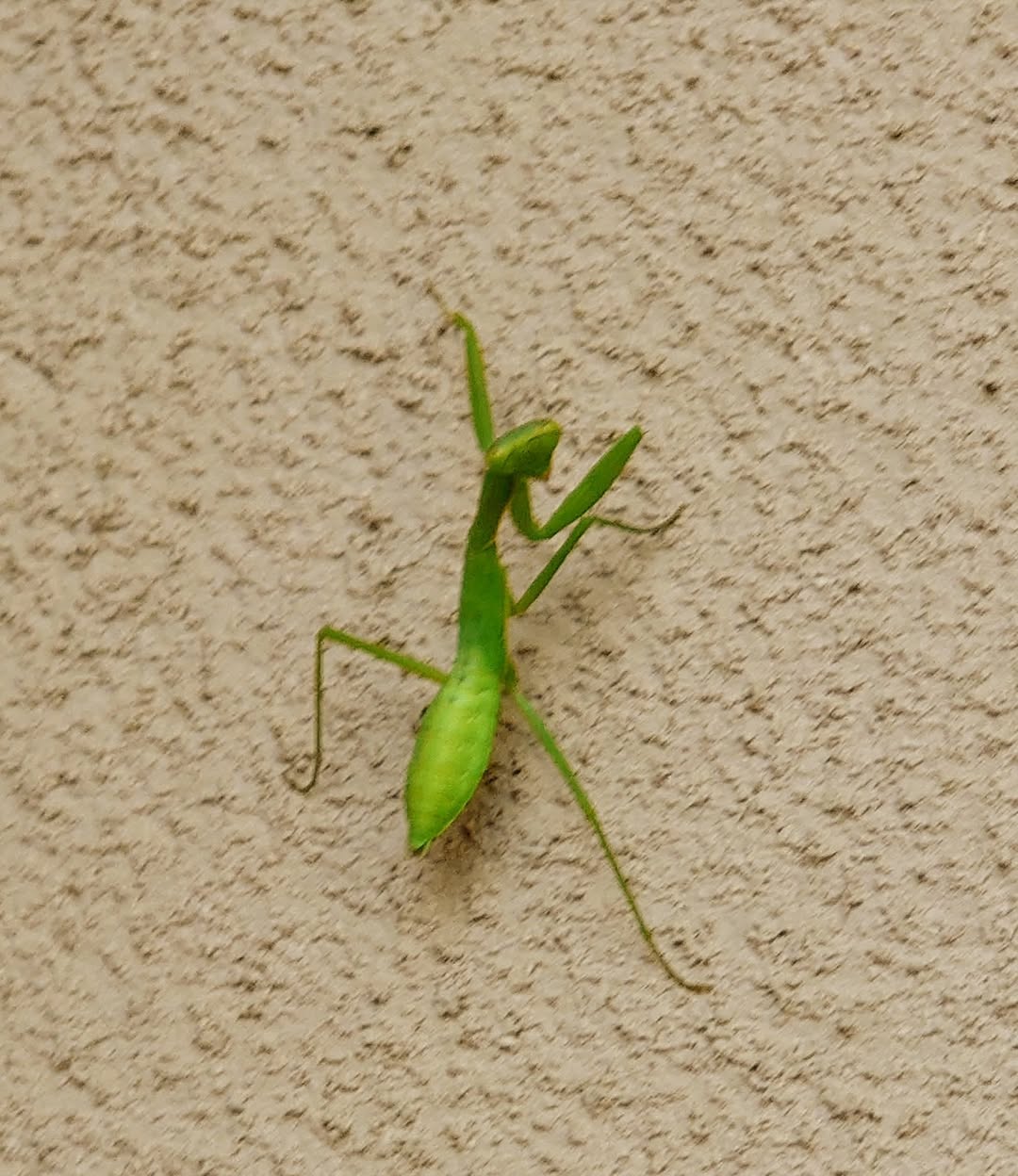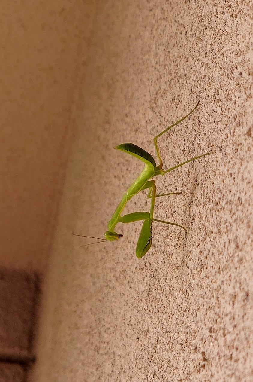 二日前、家の壁にカマキリいるなぁ(写真左)・・・と思ってたら、洗濯物に付いたのか家の中に侵入。カミさん悲鳴上げてたので、やさしく掴んで遠くに放した。