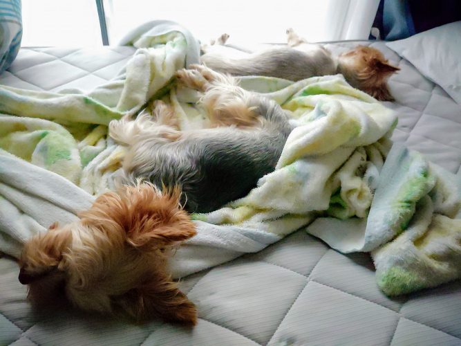 タオルケットくしゃくしゃにして、二匹それぞれで寝床を作ってお休み中。