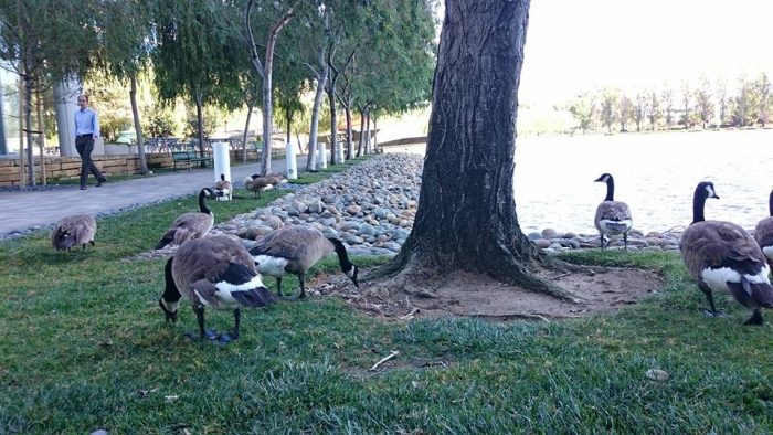 敷地をたくさんのガチョウ? が歩いている。